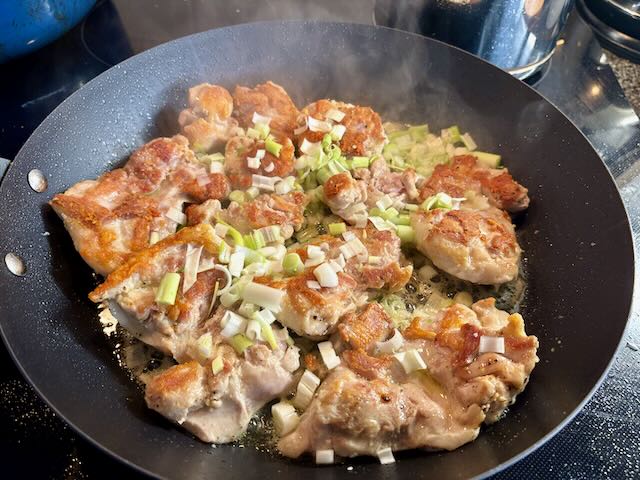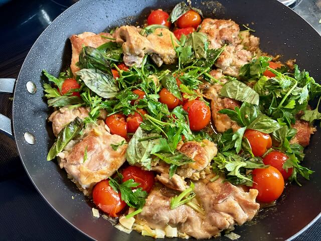 This recipe from NYT Cooking is a one-pan meal that combines chicken and scallions with tomatoes in a savoury Dijon-wine sauce. Top with fresh herbs for a pop of colour and flavour.
