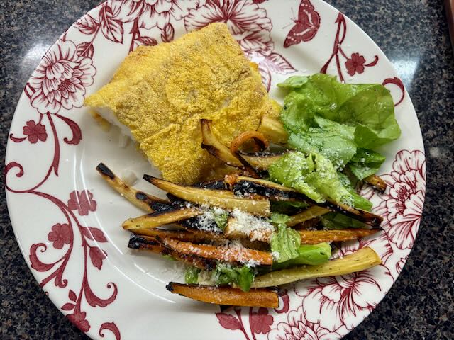 This recipe from NYT Cooking is a great side dish. Roast the parsnips until golden. Meanwhile, combine miso and lemon juice in a large bowl. Cook oil, thyme and garlic until the garlic is just golden and add to the miso mixture. Toss the arugula with the miso mixture and scatter over the parsnips. Sprinkle with Parmesan and lemon zest and serve. Cook’s note: I used a mixture of parsnips and carrots and butter lettuce instead of arugula. I omitted the lemon zest.