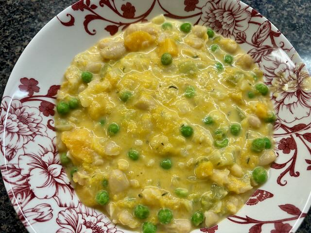 This soup, adapted from a NYT Cooking recipe, is savoury and hearty. Sauté onion and celery and then add garlic and thyme. Stir in the squash and stock and simmer until the squash is tender. Add the beans and cook for a few minutes. Add the sour cream and peas and warm through.